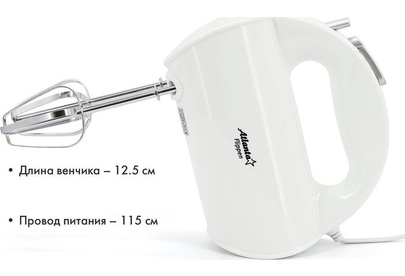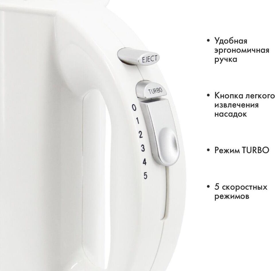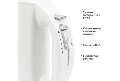 Номинальная мощность 300 Вт. Режим «Турбо». Два комплекта хромированных насадок. Кнопка легкого извлечения насадок. Пять скоростей. 230 B ~ 50 Гц