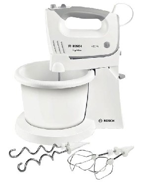 Мощность 450 Вт. Тип стационарный. Чаша пластик. Число скоростей 5. Доп. режим турбо. Количество насадок 2. Насадки: венчик для взбивания, крюки для теста. Материал корпуса пластик.