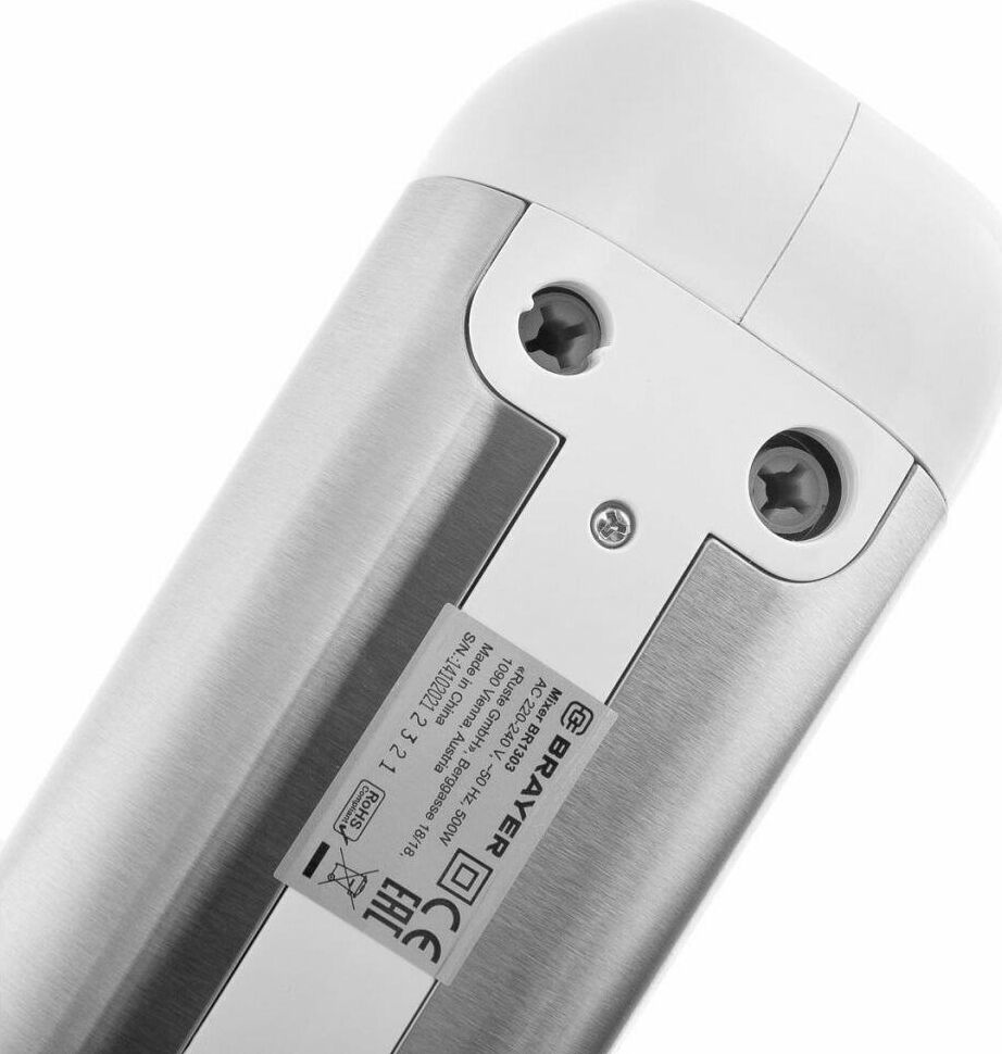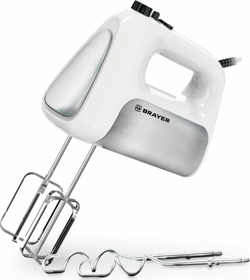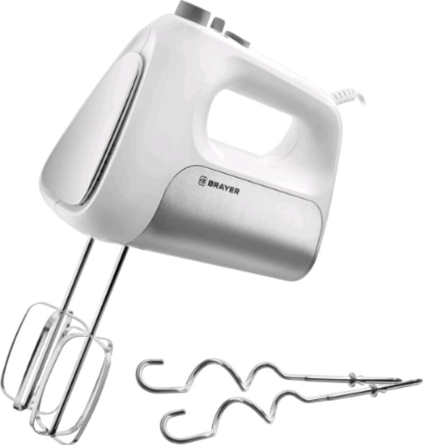 1303BR Миксер BRAYER, 500 Вт, корп.из нерж.стали, 5 режимов, 2 крюка, 2 венчика Мощность 500 Вт. 5 скоростных режимов 2 венчика для взбивания 2 крюка для замешивания теста Турборежим Кнопка для освобождения насадок