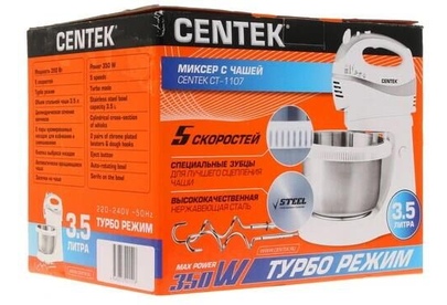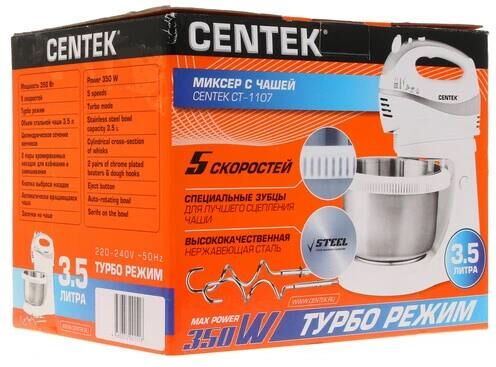 Миксер с чашей Centek CT-1107 (бел/сталь) 320Вт, СТАЛЬНАЯ ЧАША, 3.5л, 5 скоростей+турбо,