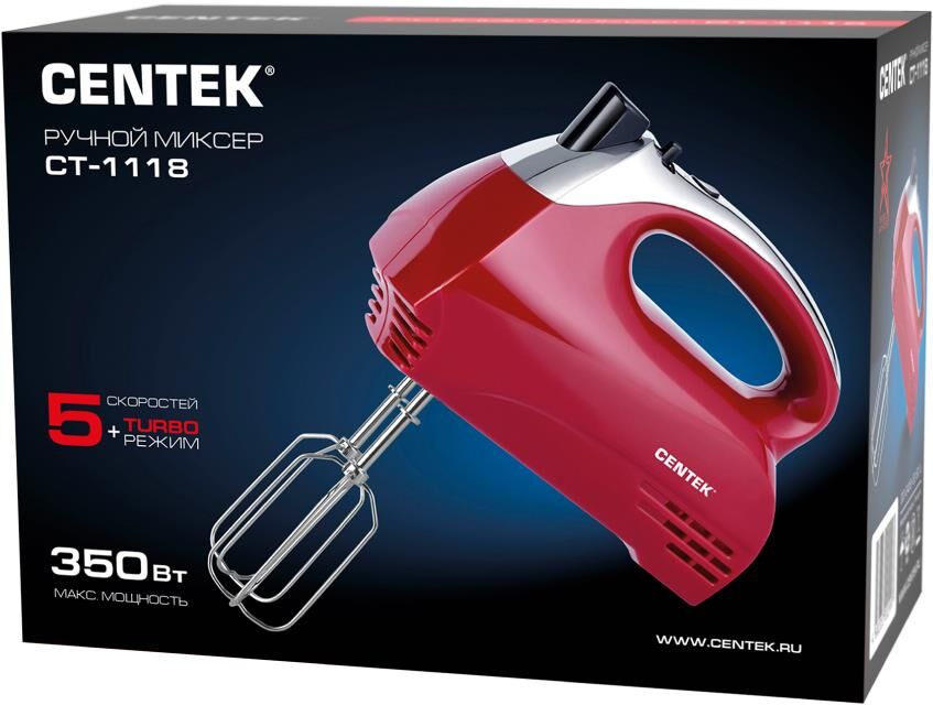 Миксер Centek CT-1118 (хром/вишня) 350Вт, 5 скоростей+турбо, взбивание/замешивание