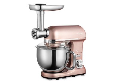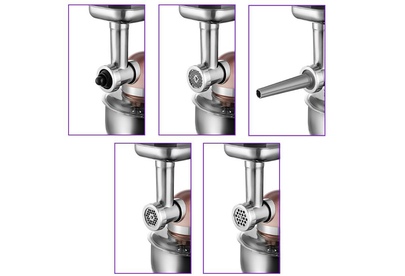 Мощность 1000 Вт. Ёмкость чаши 5 л. Материал чаши нержавеющая сталь. Производительность мясорубки 1,4 кг/мин. Длина шнура 1,2 м. Материал корпуса нержавеющая сталь. Количество скоростей 6 + импульсный режим. Количество насадок 12. Размер прибора 348 х 272 х 345 мм.