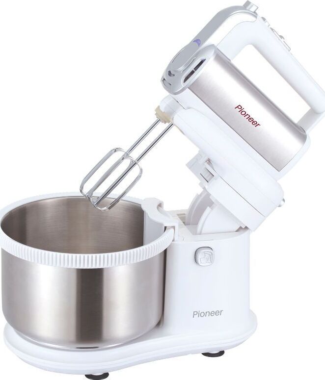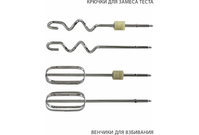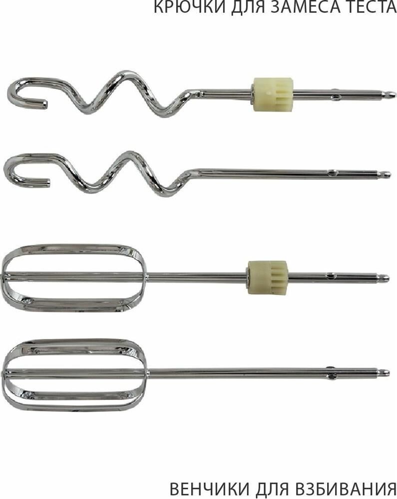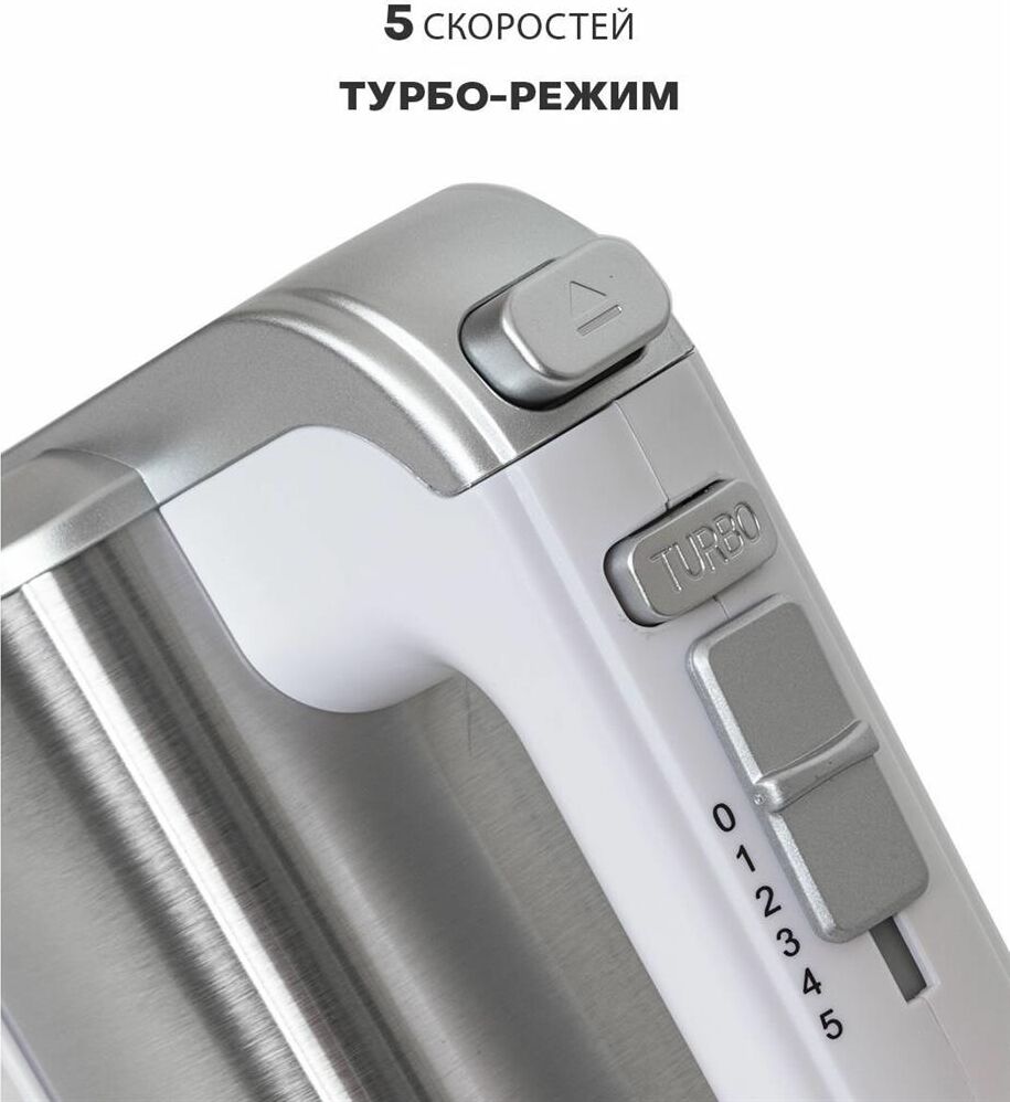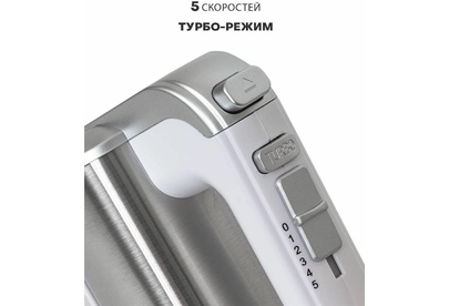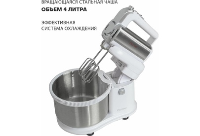 Миксер 2 в 1, ручной + стационарный, максимальная мощность 450 ватт, объем чаши 4 литра, автоматическая вращающаяся чаша, 5 скоростей, режим - Турбо, пониженный уровень шума, веньчики для взбивания яиц и крема, крючки для замеса теста