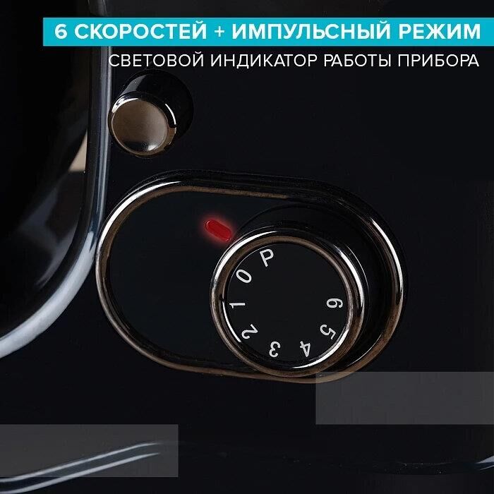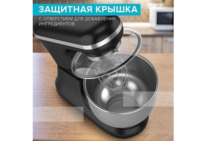 Максимальная мощность 1400 Вт Номинальная мощность 1200Вт Объем чаши 5.2 л 6 скоростей + импульсный режим Яркая подсветка скоростной панели Материал чаши и венчика – нержавеющая сталь Длина Шнура 1м Плюсы: Работу важнейших элементов обеспечивают металлические шестеренки Защита от перегрева и перегрузки Прозрачная крышка с отверстием для добавления ингредиентов Защита от включения с открытой чашей Чашу миксера и венчик можно мыть в посудомоечной машине Венчик для взбивания, крюк для замешивания теста, лопатка для смешивания, крышка с отверстием для добавления ингредиентов