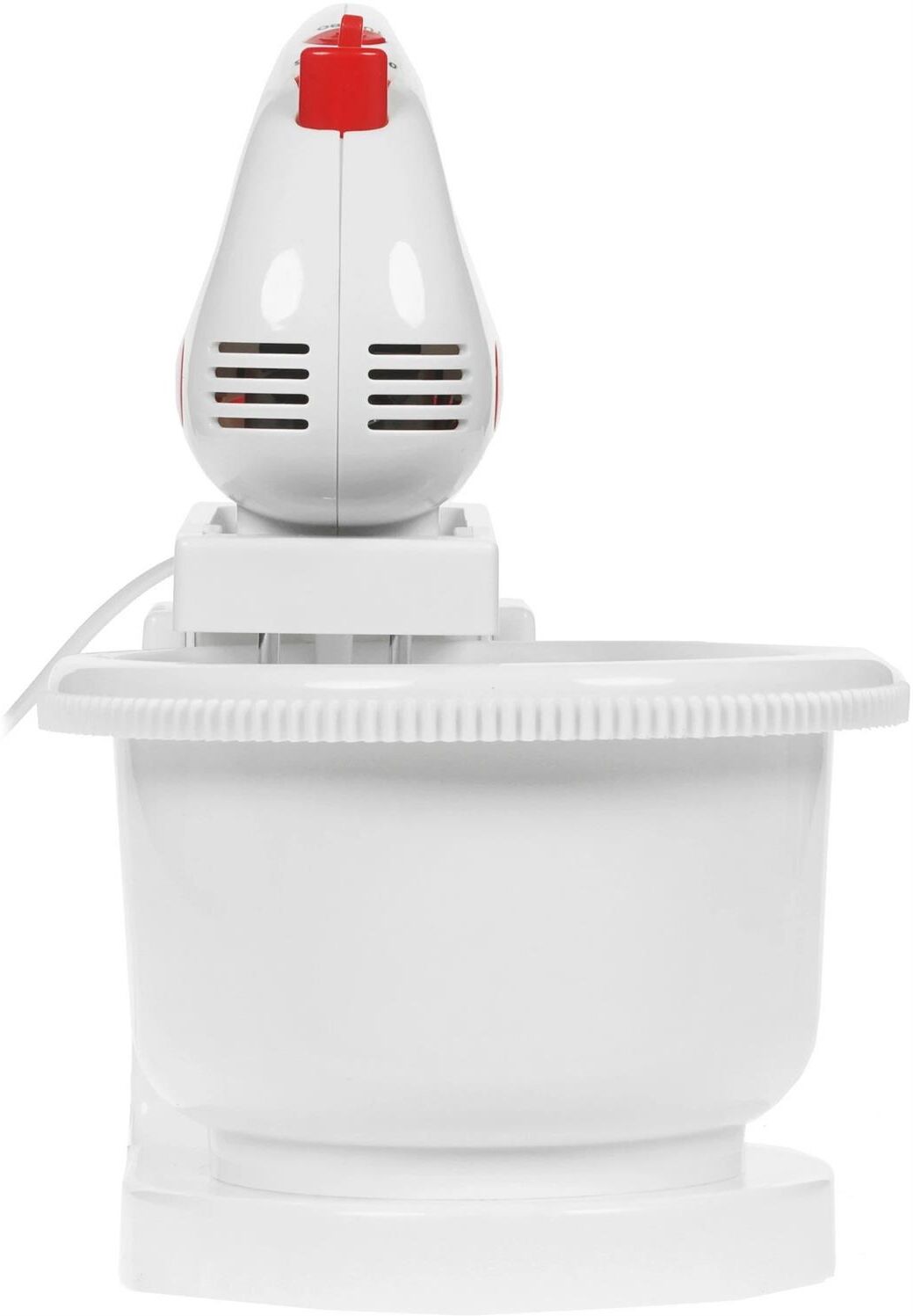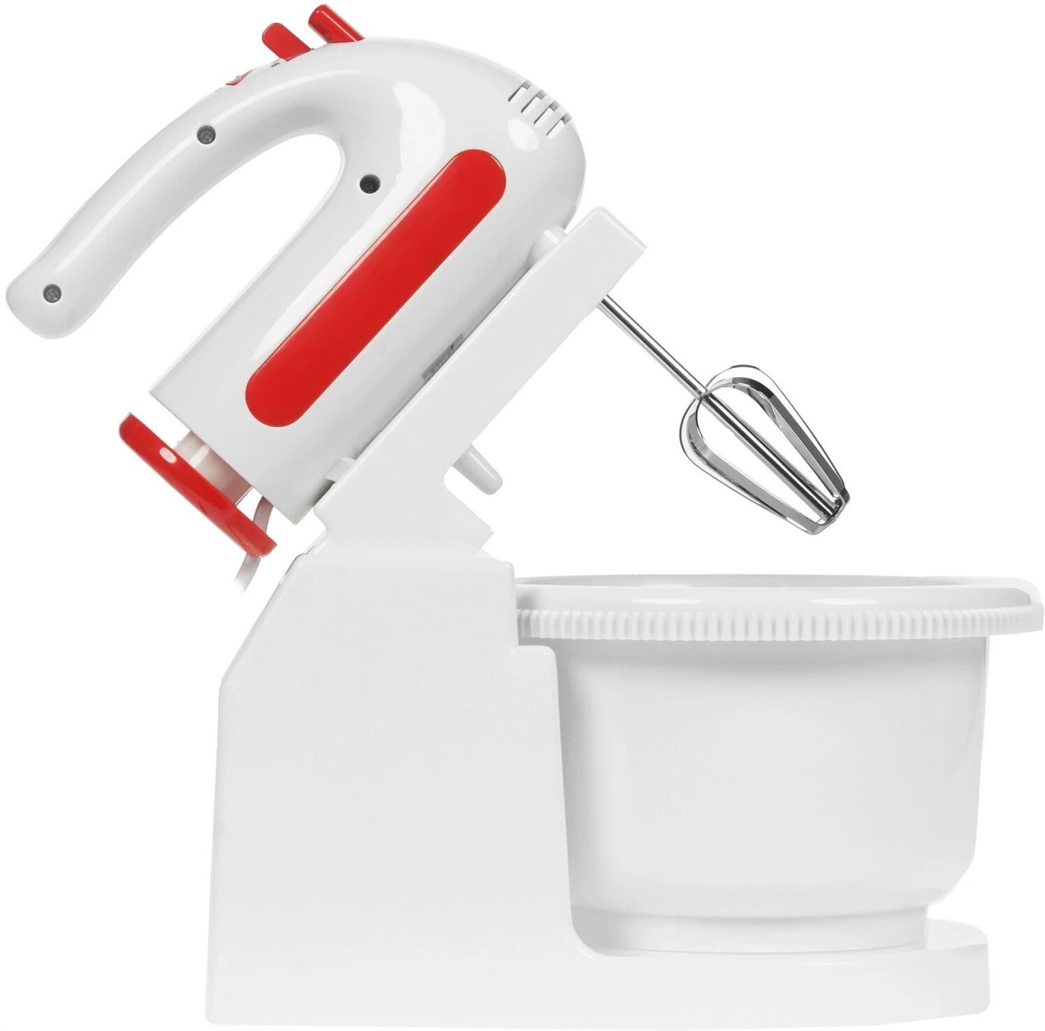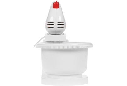 Миксер с вращающейся чашей, 300W, 5 скоростей работы, кнопка извлечения насадок, двойной набор насадок: два венчика для взбивания яиц и кремов, две насадки для размешивания тяжелого теста, смешивание жидкостей, замешивание теста, приготовление пюре, взбивание сливок и белков.