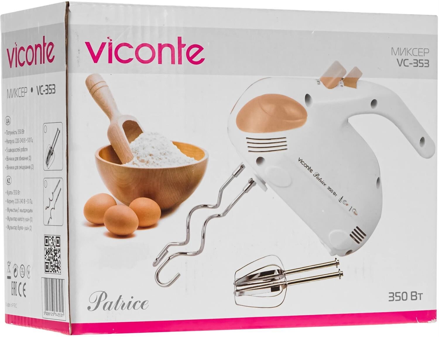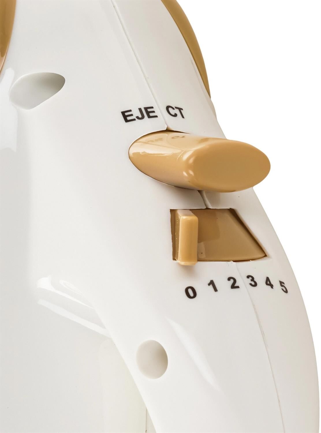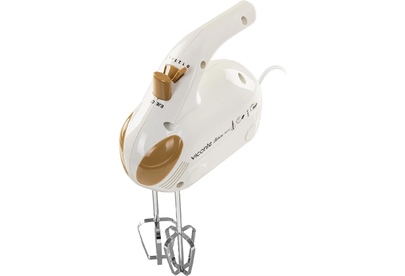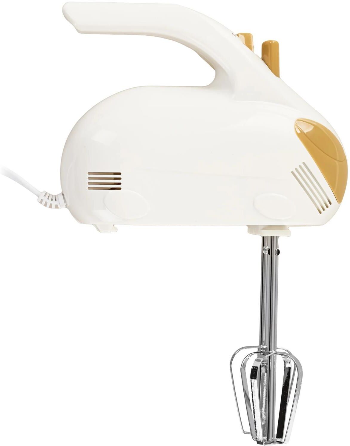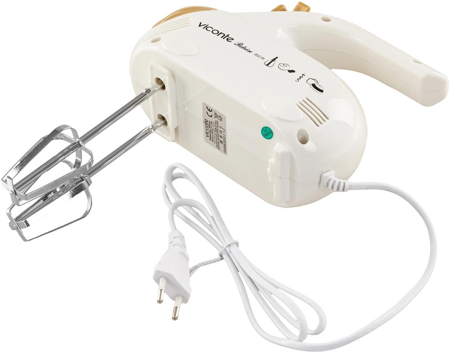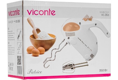 Миксер, 350W, 5 скоростей работы, кнопка извлечения насадок, двойной набор насадок: два венчика для взбивания яиц и кремов, две насадки для размешивания тяжелого теста, смешивание жидкостей, замешивание теста, приготовление пюре, взбивание сливок и белков