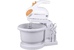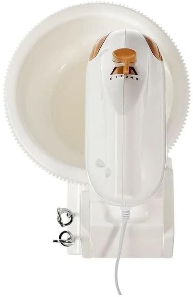 Миксер с вращающейся чашей, 350W, 5 скоростей работы, кнопка извлечения насадок, двойной набор насадок: два венчика для взбивания яиц и кремов, две насадки для размешивания тяжелого теста, смешивание жидкостей, замешивание теста, приготовление пюре, взбивание сливок и белков.