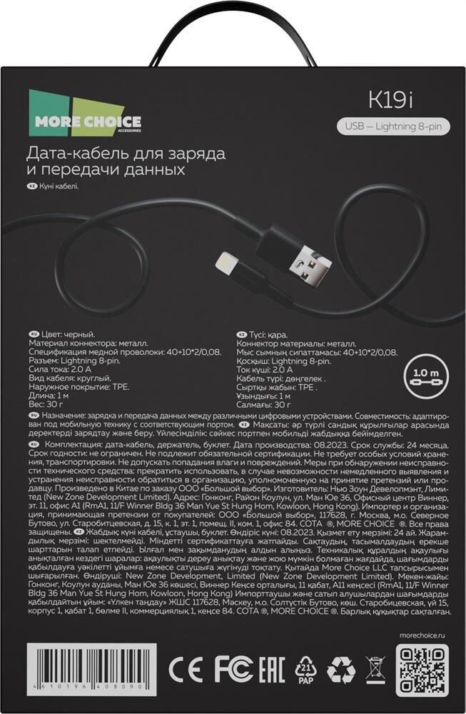 Дата-кабель More choice K19i - оптимальное сочетание высокого качества и доступной цены. Он обладает высокой производительностью и практичностью, что делает его идеальным выбором для всех, кто ищет надежный кабель для своего телефона. Оптимальная длина шнура в 1 метр позволит без труда подключить и удобно расположить все устройства в рабочем пространстве. Применять его можно с любой портативной техникой, снабженной интерфейсом подключения Lightning 8-pin. Кабель поддерживает функции зарядки и передачи данных между устройствами. Длина кабеля – 1 м, вес – 30 г. Выполнен в черном и белом цветах.