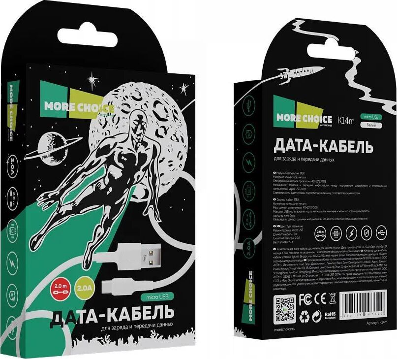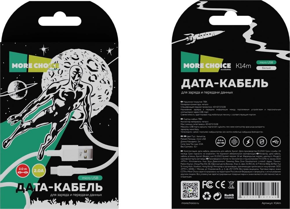 Дата-кабель USB 2A для micro USB More choice K14m 2м Разъем: micro USB Совместимость: адаптирован под любую мобильную технику, оснащенную портом micro USB Длина: 2 м Сила тока: 2.0А Наружное покрытие: ПВХ Материал коннектора: металл Спецификация медной проволоки: 40+10*2/0,08 Назначение: зарядка и передача информации между портативным устройством и персональным компьютером через USB-порт. Вес: 51 г Комплектация: дата-кабель micro USB 2.0А, держатель для кабеля, буклет. Размер упаковки: 85*150*16 Цвета: Black, White