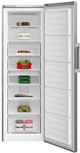 Вертикальный морозильник. Размеры (ВхШхГ), см: 185х60х65. Общий объем 312 л. Полезный объем 275 л. 1 компрессор (R600a). Электронное управление, внутренний дисплей. Система размораживания: No Frost. Быстрая заморозка Quick Freeze. Время сохранения t°C без электричества: 18 ч. Уровень шума: 39 дБ. Перенавешиваемая дверца. Внешняя ручка. Антибактериальное покрытие резинового уплотнителя. Cигнал открытой двери, 6 ящиков, 2 полки, лоток для льда, лоток для пельменей. Мощность замораживания: 16 кг/24 ч. Климатический класс: SN-T. Класс энергетической эффективности: А+. Энергопотребление в год: 324 кВт/ч. Цвет: серебристый.