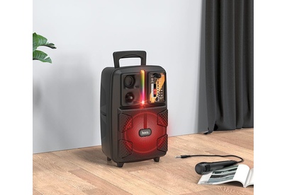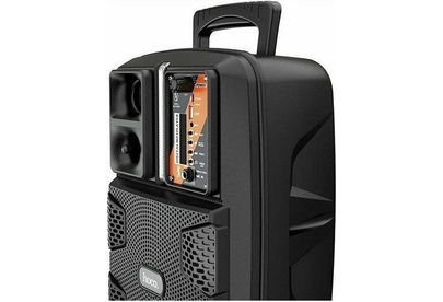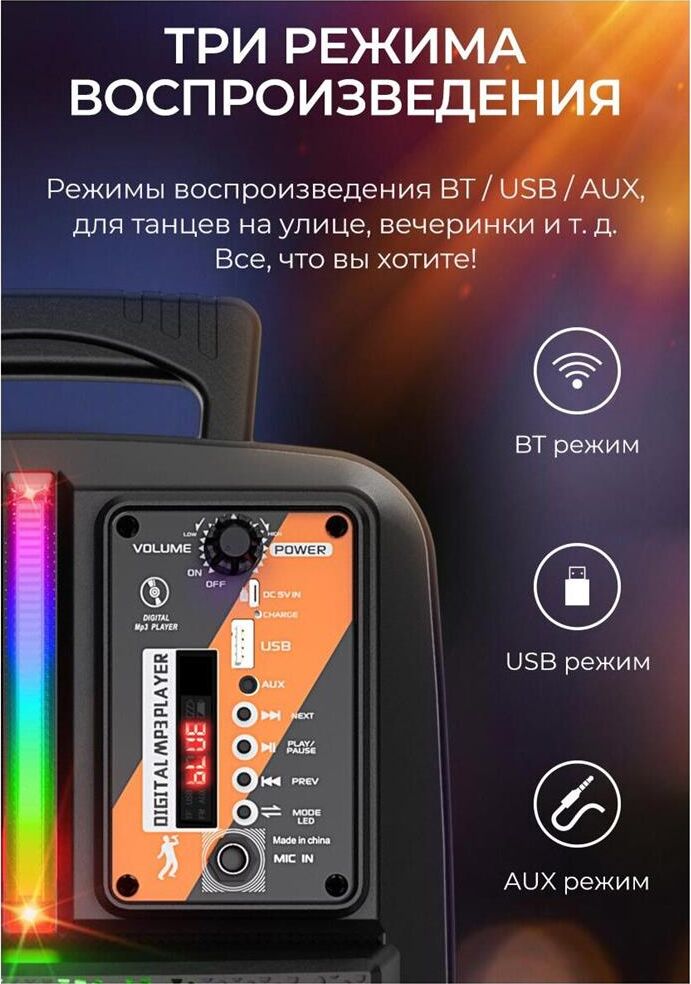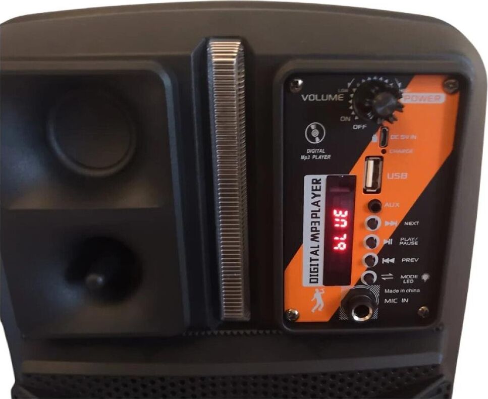 Спикер: 8 дюймов 2Ом 15W. Аккумулятор: 1800mAh, класс A, 18650. BT спецификация: BT V5.0 Zhongke Blue Flood. Функции: поддержка BT проигрывания / BT TWS соединения, FM, USB, AUX режимов проигрывания, вход для проводного микрофона. Поддержка переключения подсветки. Зарядное напряжение: DC 5V, время зарядки около 2.5 часов. В режиме музыки: около 3 часов (при громкости 80%). Размеры: 592*510*388 мм. Вес: 1.9 кг.
