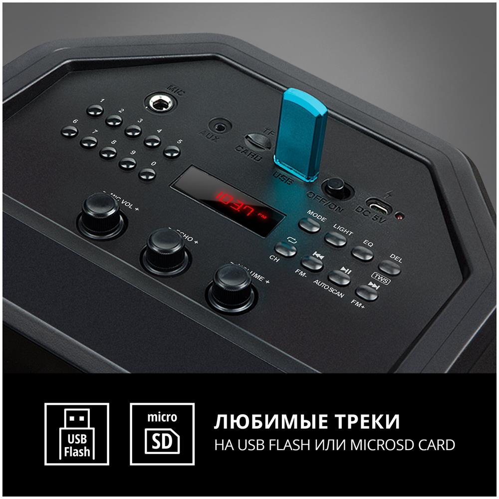 Выходная мощность (RMS), Вт 65 (2 x 32.5) Частотный диапазон, Гц 45 – 22 000 Диапазон частот тюнера, МГц 87.5 – 108 Размеры динамиков, мм ВЧ: O 70, НЧ: O 140 Беспроводная передача сигнала по Bluetooth да Воспроизведение музыки с носителей памяти USB, microSD Источник питания литий-ионный aккумулятор: 4400 мA · час (2 шт.) / USB: DC 5 V Тип соединения Bluetooth, проводной Радиус действия, м до 10 Размеры изделия, мм 470 ? 240 ? 240 Вес, кг 4,15 Цвет черный