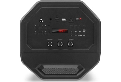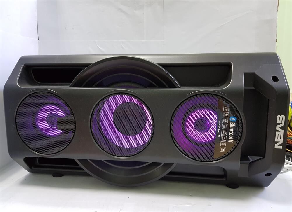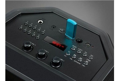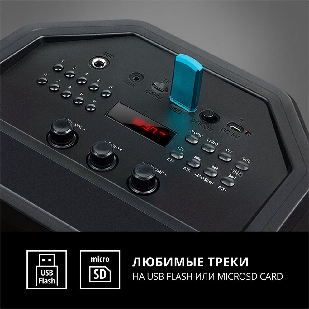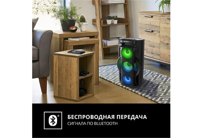 Многофункциональная портативная акустическая система с подсветкой, Bluetooth, LED-дисплей, встроенный эквалайзер, встроенное FM-радио, выходная мощность (RMS), Вт 65 (2 x 32.5), частотный диапазон, Гц 45 – 22 000, диапазон частот тюнера, МГц - 87.5 – 108, размеры динамиков, мм - ВЧ: O 70, НЧ: O 140, воспроизведение музыки с носителей памяти USB, microSD, источник питания литий-ионный aккумулятор: 4400 мA · час (2 шт.) / USB: DC 5 V, тип соединения Bluetooth, проводной, радиус действия, м - до 10, размеры изделия, мм 470 х 240 х 240, вес - 4,35 кг.