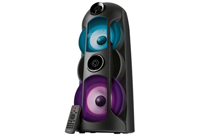 Мобильная аудиосистема с Bluetooth и FM-радио, выходная мощность (RMS), Вт 80 (2 х 40), частотный диапазон, Гц 45 – 22 000, диапазон частот тюнера, МГц 87.5 – 108, размеры динамиков, мм ВЧ: O 32, НЧ: O 145, беспроводная передача сигнала по Bluetooth, воспроизведение музыки с носителей памяти USB, microSD, источник питания литий-ионный aккумулятор: 4400 мA · час (2 шт.) / USB: DC 5 V, радиус действия, м - до 10, размеры изделия, мм - 230 х 640 х 260, вес - 5,2 кг.