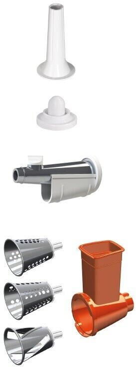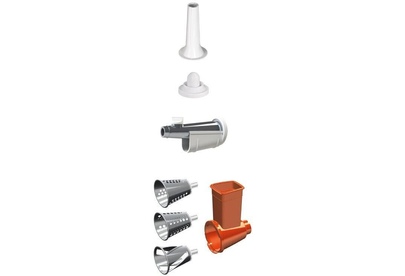 В комплекте: - приставка-соковыжималка; - приставка-овощерезка (4 барабана для шинкования и резки). Подходит ко всем мясорубкам линеек М61, М62, М641, М642, М63