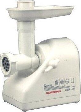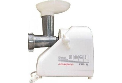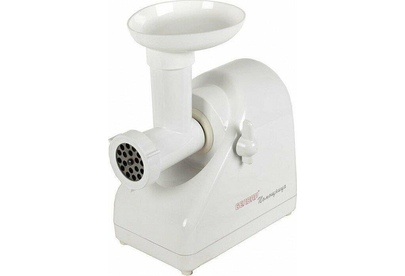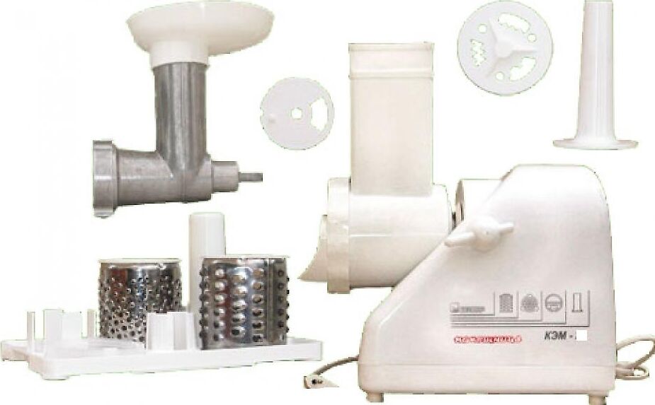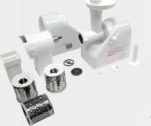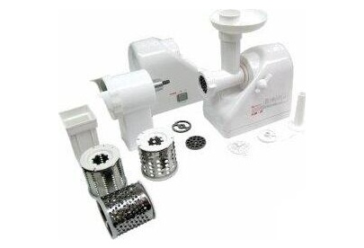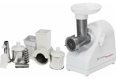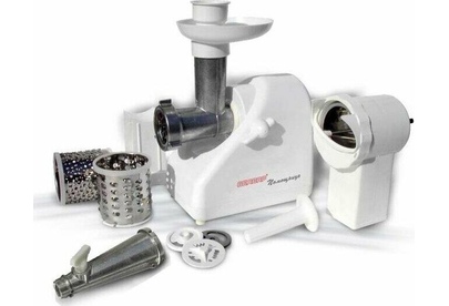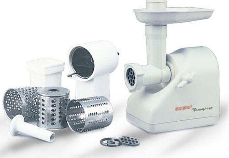 Мощность 400 Вт, шинковка, реверс, насадка для теста, насадка для колбас, белое эмалированное покрытие приставки-мясорубки, 4 сменных барабана