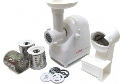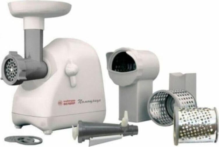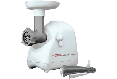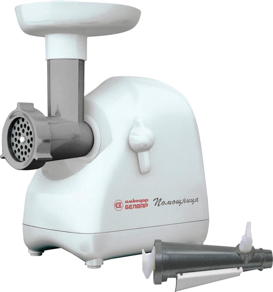 Мясорубка Белвар Помощница КЭМ-П2У 302-06, макс. мощность 1500Вт, номинальная от 220Вт, шинковка, реверс, насадка д/теста, насадка д/колбас, белое эмал. покрытие, приставка-мясорубка, 4 смен. барабана, 3 смен. решетки, основание д/хранения насадок.