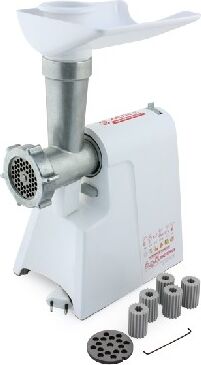 Макс. мощность 600Вт. Производительность 40кг/ч. 3 скорости. Сервисная функция «Момент». 2 решётки с отверстиями диаметром 4,4 мм,7 мм. 5 запасных переходников в комплекте. Надежный саблевидный нож позволяет приготовить пышный и нежный фарш, с минимальной потерей сока из волокон.