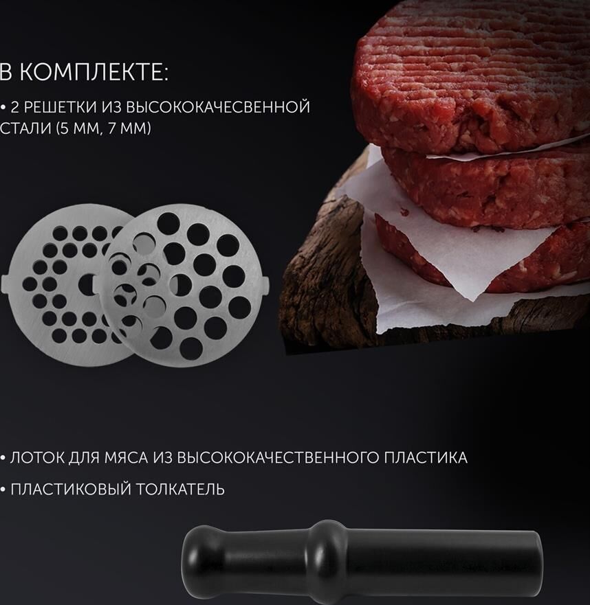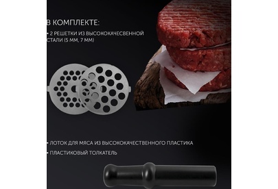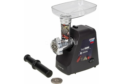 Мощность 1800 Вт.Производительность, кг/мин 2.Материал корпуса пластик. Нескользящие ножки.В комплекте: -2 решетки из высококачесвенной стали (5 мм, 7 мм).Лоток для мяса из высококачественного пластика.Пластиковый толкатель.
