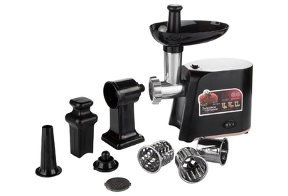 REDMOND RMG-1223-6 (Черный) Напряжение 220-240 В, 50 Гц Номинальная мощность 300 Вт Максимальная мощность 1000 Вт Защита от поражения электротоком класс II Скорость вращения шнека 240 об/мин ± 10% Производительность до 1,5 кг/мин Функция реверса есть Защита от перегрева есть Количество перфорированных дисков для приготовления фарша 2 Насадка для приготовления колбасок есть Насадка для приготовления кеббе есть Овощерезка есть Механический фиксатор блока мясорубки есть Габаритные размеры (моторный блок) 435 х 290 х 135 мм Вес нетто (в полной комплектации) 2,2 кг ± 3% Длина электрошнура 0,8 м Комплектация: - моторный блок - шнек мясорубки - нож мясорубки - блок мясорубки - загрузочный лоток - фиксирующее кольцо - перфорированные диски для различных видов фарша (2 шт.) - толкатель мясорубки - основание насадки для кеббе - формирующая насадка для кеббе - формирующая насадка для колбасок - мелкая тёрка - крупная тёрка - шинковка - блок овощерезки - толкатель овощерезки