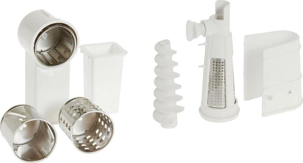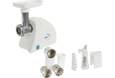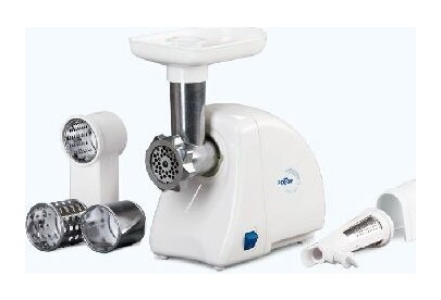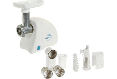 Мощность 1500Вт, РЕВЕРС, металлический привод-шнек, кухонный комбайн (три насадки для шинкования овощей, насадка-соковыжималка).
