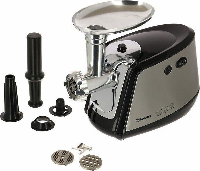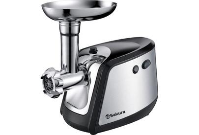 Мясорубка электрическая, 1500 Вт, с функцией реверса, насадками кеббе, для приготовления сосисок и тремя дисками в комплекте. Материал корпуса: пластик. Материал лотка: металл.
