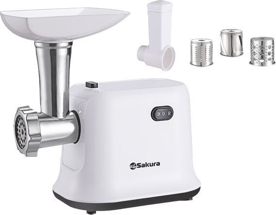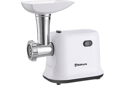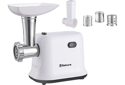 Мясорубка электрическая, 1500 Вт, функция реверс, корпус из эко-пластика, пластиковый лоток для продуктов и толкатель, металл. шнек, нож из нерж.стали, металл диск для измельчения (5 мм), отключение при перегреве.3 насадки-тёрки.