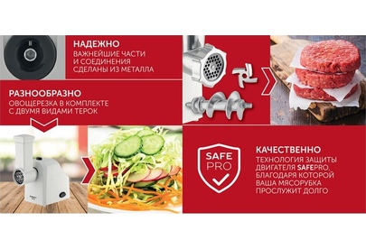 Тип: С овощерезками Мощность, Вт: 1800 Производительность : 2 Функция реверс: Да Перфорированные диски для мяса, размер отверстий мм: 5 и 7 мм Насадка кеббе: Да Насадка для приготовления домашних сосисок: Да Насадки для терки и шинковки овощей, шт.: 2 Цвет: Белый
