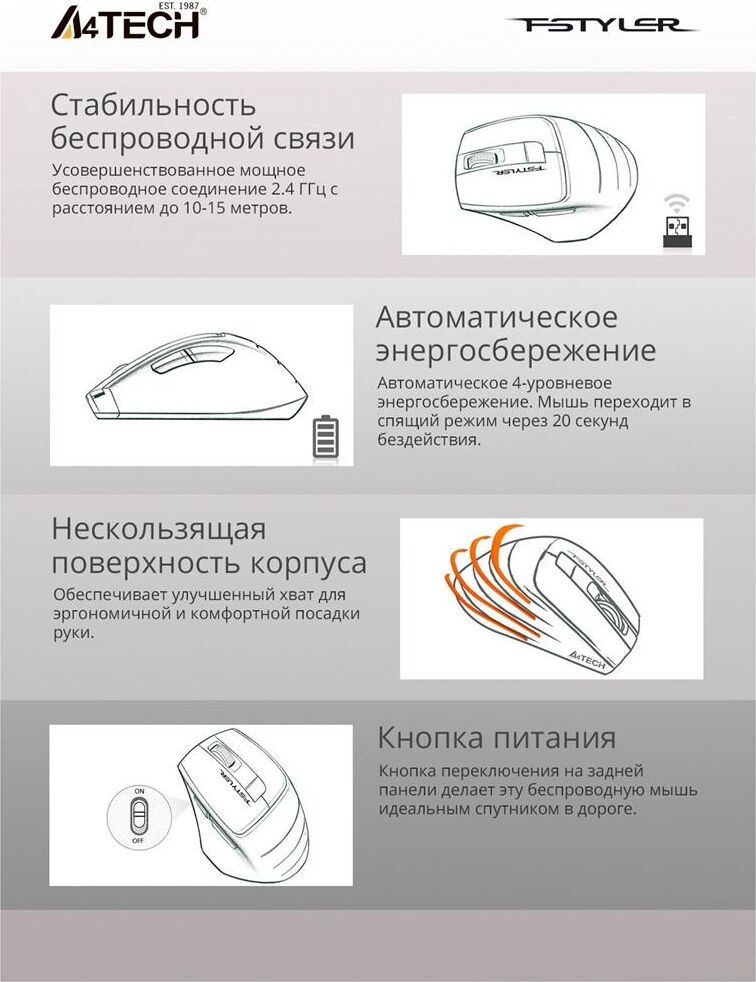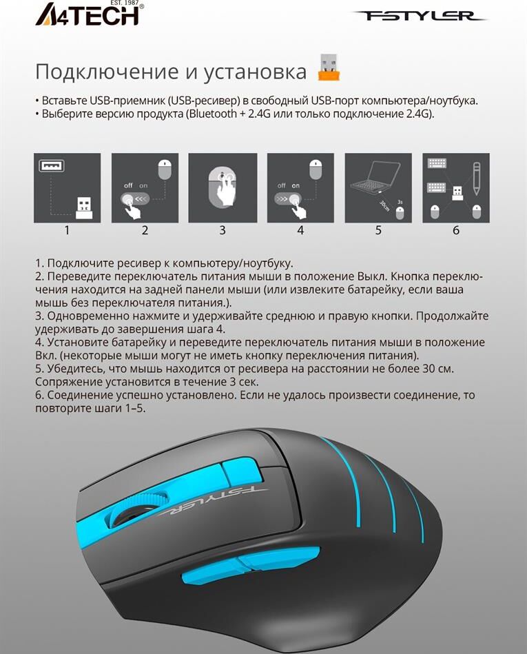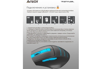 Подключение: 2,4 Гц Рабочий диапазон: 10-15 м Эргономичный дизайн: правая посадка Датчик: Оптический Частота отчетов: 125 Гц Кнопки № 6 Приемник: нано USB приемник Размер: 105 ? 70 ? 42 мм Вес: 76 г Батарея: 1AA щелочная батарея до года работы на одной батарее