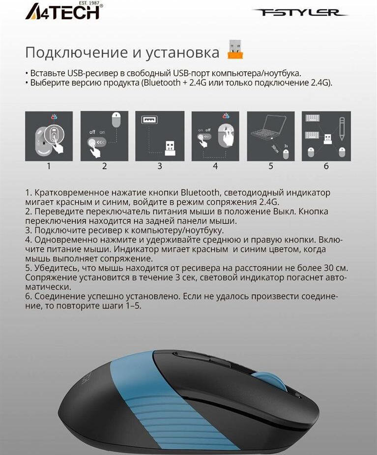 Мышь беспроводная A4TECH Мышь Fstyler FB10C черный/синий оптическая 2000dpi беспров. BT/Radio USB 4but (FB10C ASH BLUE