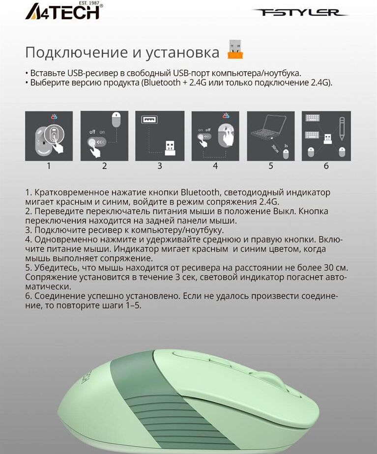 Мышь беспроводная A4TECH Мышь Fstyler FB10C зеленый оптическая 2000dpi беспров. BT/Radio USB 4but (FB10C MATCHA GREEN)
