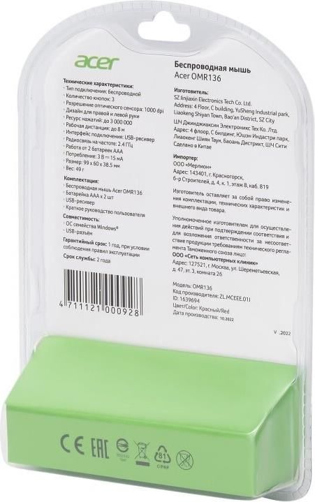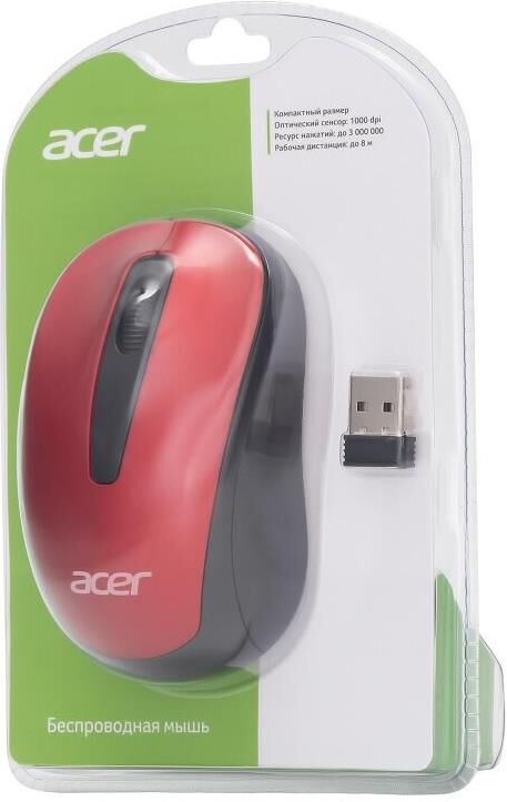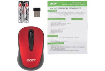 Мышь беспроводная ACER Мышь OMR136 красный оптическая (1000dpi) беспроводная USB для ноутбука (2but)
