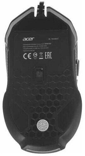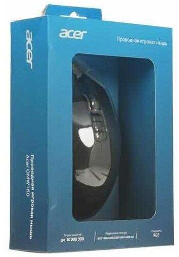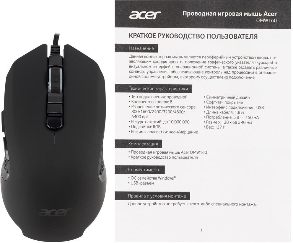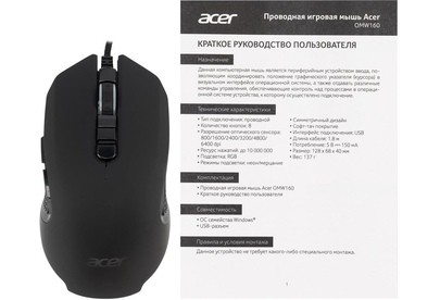 Общие характеристики Бренд ACER Модель OMW160 Технология оптическая Тип соединения мыши проводная Интерфейс подключения USB Подключение по USB есть Длина провода 1.8 м Сенсор Разрешение сенсора, макс. 6400 dpi Поддержка разрешений 800/1600/2400/3200/4800/6400 dpi dpi Изменение чувствительности сенсора есть Максимальное ускорение 20 G Кнопки Количество кнопок 8 Колесо прокрутки есть Конструкция Хват для правой руки Для геймеров да Электропитание Питание от по шине Дополнительно Подсветка есть MTBF 10000000 кликов Комплектация Полную комплектацию товара уточняйте у производителя Размеры, цвет Цвет черный Размеры мыши (ДхШхВ) 128 х 68 х 40 мм Вес 137 грамм