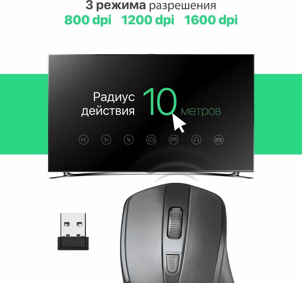 Мышь беспроводная, интерфейс подключения USB, тип сенсора -оптический, рабочая частота 2.4 ГГц, количество кнопок: 3 + колесо-кнопка, разрешение сменное - 800/1200/1600 dpi, питание - 2 хAAA (в комплекте).