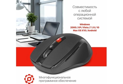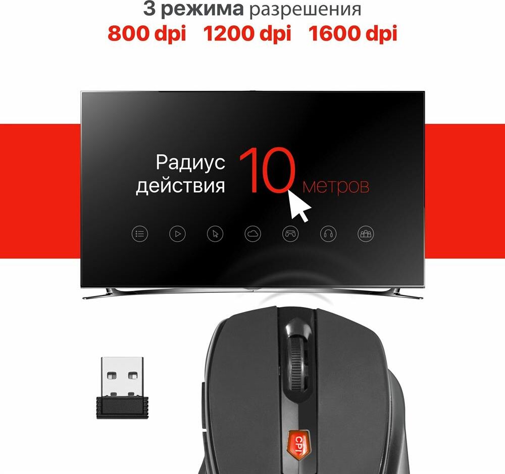 Мышь беспроводная, оптическая, сменное разрешение 800/1200/1600 dpi, количество кнопок: 5 +колесо прокрутки, интерфейс подключения USB, эргономичная форма, батарейка 1хАА (в комплекте), цвет - черный.