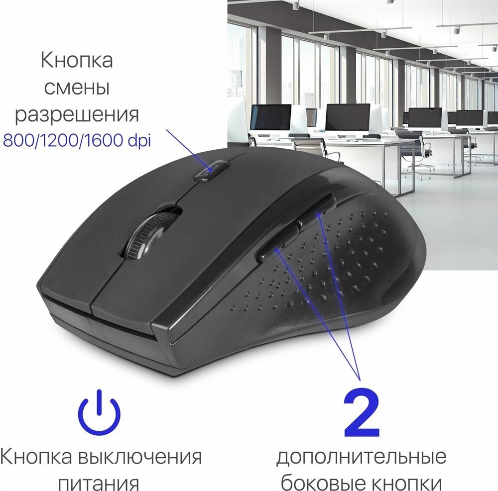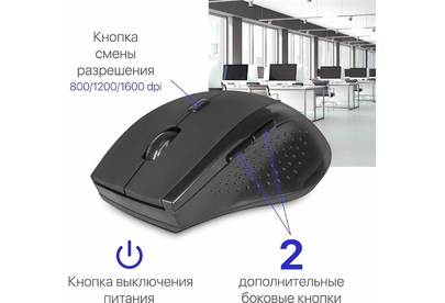 Мышь беспроводная оптическая, интерфейс USB, 5 клавиш+ колесо-кнопка, сменное разрешение сенсора 800/1200/1600 dpi, питание - 2 хAAA (в комплекте) цвет: черный.