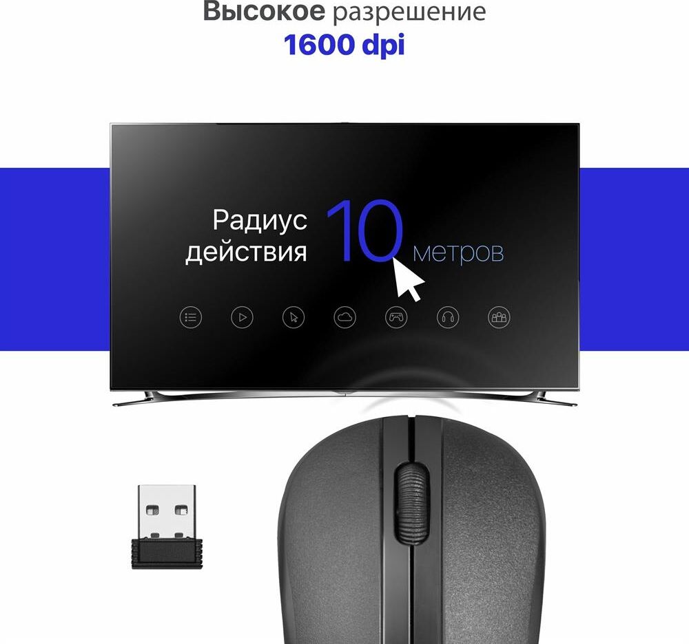 Мышь беспроводная оптическая, интерфейс USB, 2 клавиши+ колесо-кнопка, разрешение сенсора 1600 dpi, радиус действия - до 10 м.