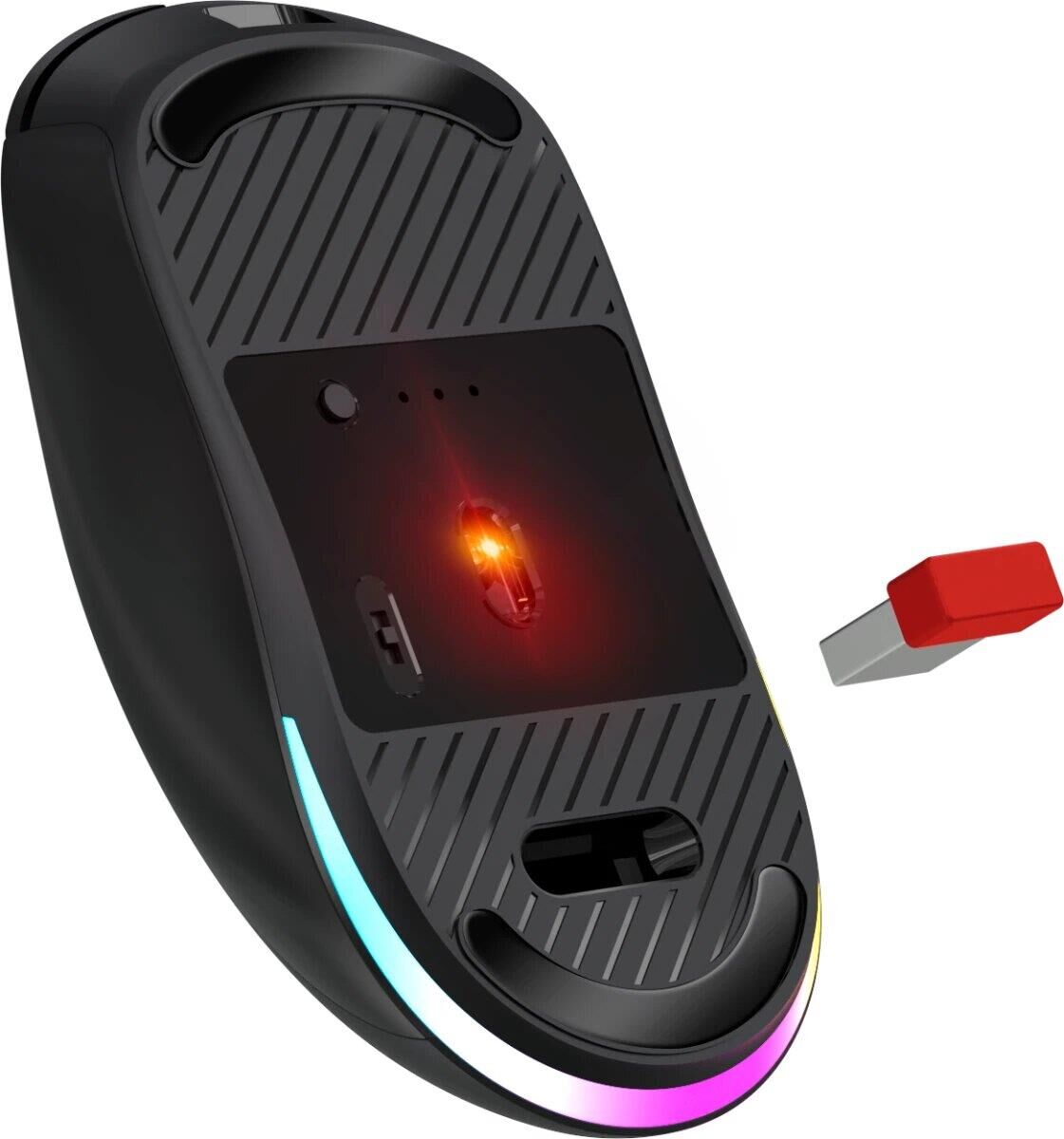 Эргономичная игровая мышь с тремя режимами подключения: проводное, беспроводное по радиоканалу 2.4 Ггц, беспроводное подключение по Bluetooth. Данная модель поддерживает постоянное хранение в памяти двух устройств для подключения по Bluetooth. Также мышь имеет 6 режимов RGB подсветки, встроенный аккумулятор на 400 мАч и тефлоновые ножки для легкого скольжения по поверхности стола.
