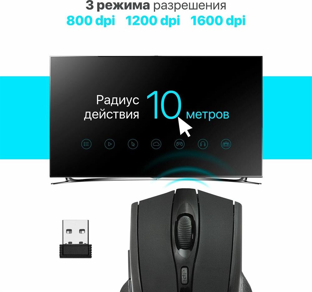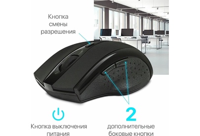 USB, разрешение 800/1200/1600 dpi, 5 + колесо-кнопка, кнопка смены разрешения позволяет менять скорость курсора мыши одним нажатием, радиус действия - до 10 метров