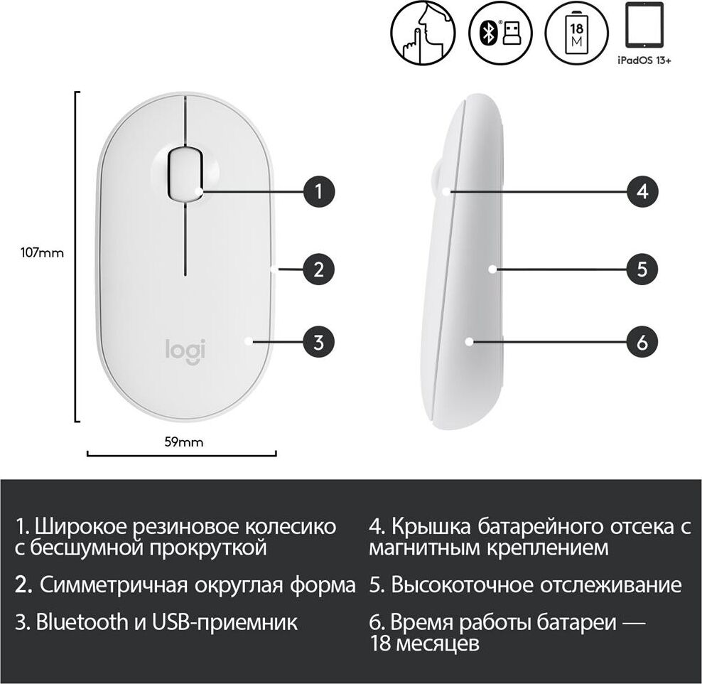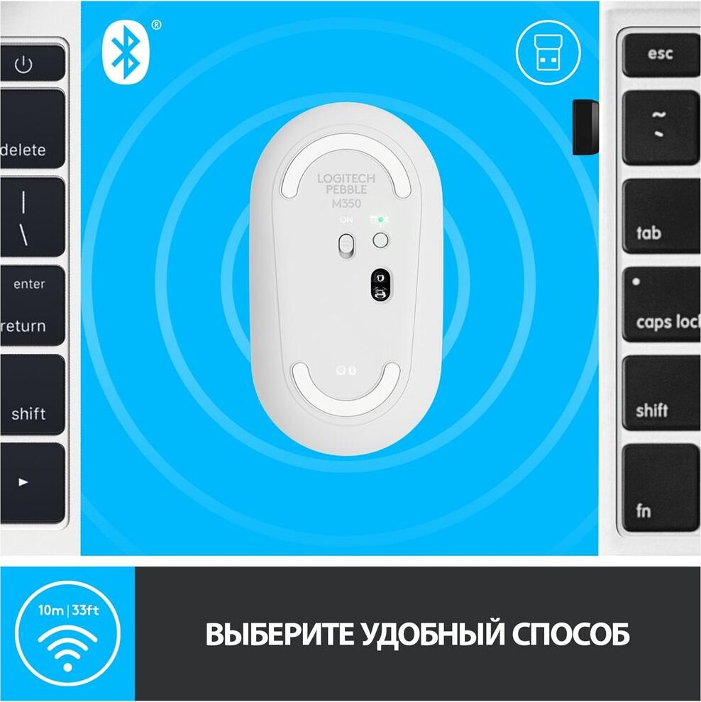 Мышь беспроводная LOGITECH Мышь Pebble M350 белый оптическая 1000dpi silent беспров. BT/Radio USB для ноутбука 3but (9