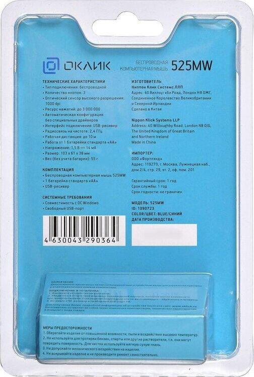 Мышь беспроводная, оптическая, интерфейс USB, разрешение 1000 dpi, количество клавиш - 3, цвет : синий