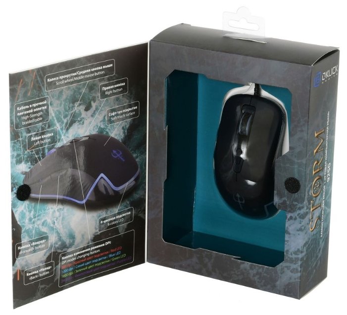 Мышь игровая, проводная, оптическая, интерфейс USB, количество кнопок - 6, колесо проктуртки, изменяемое разрешение - 800/1000/1600/2400 dpi, покрытие soft-touch, яркая подсветка корпуса, длина кабеля - 1,5м