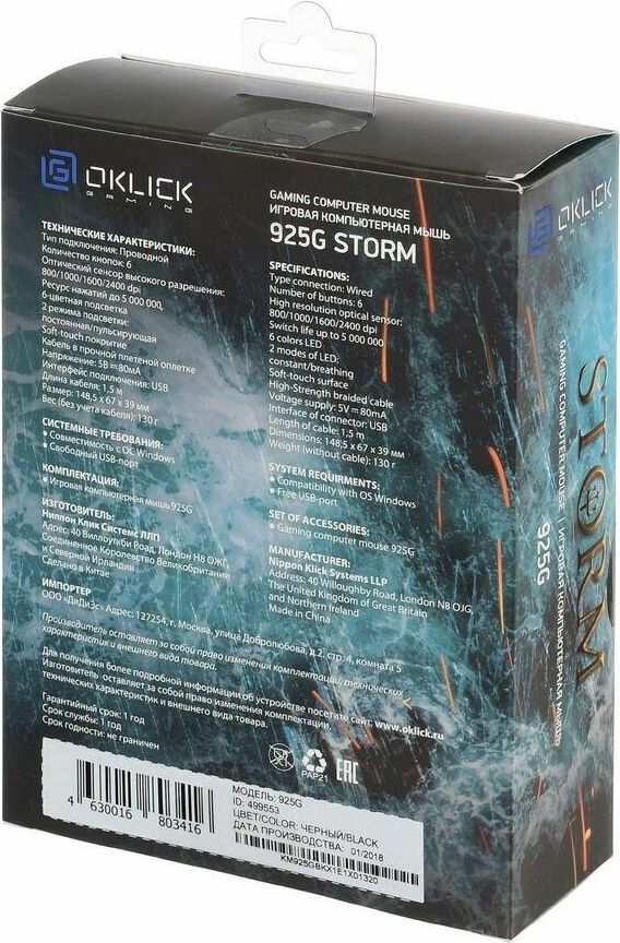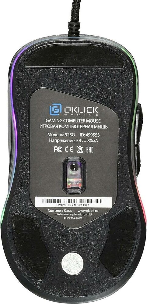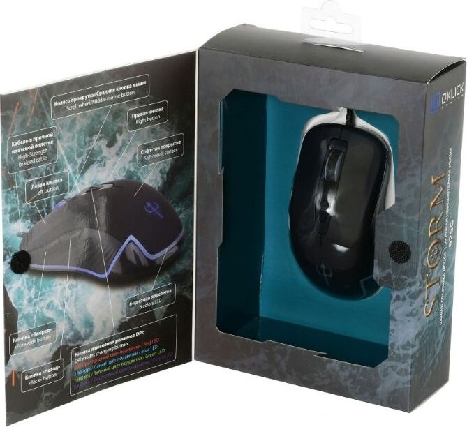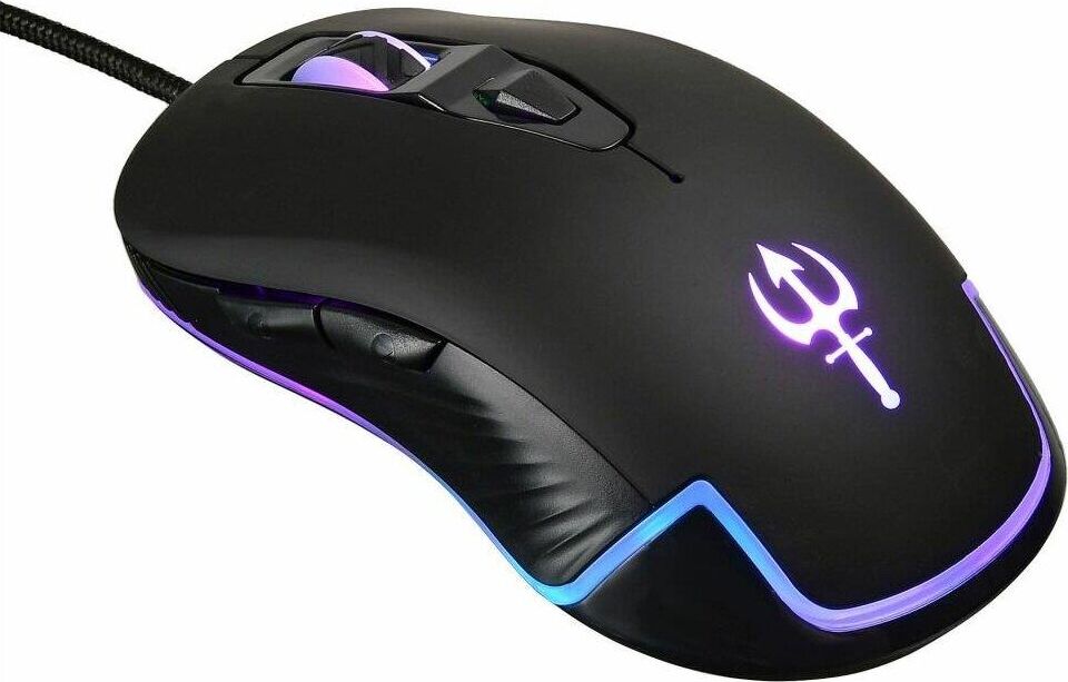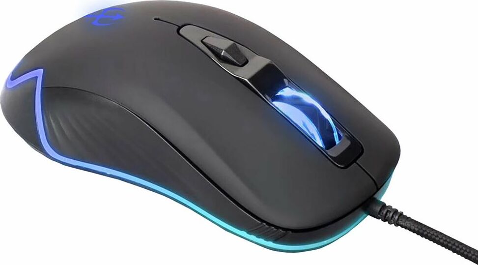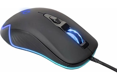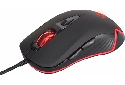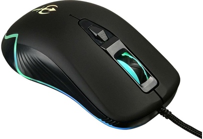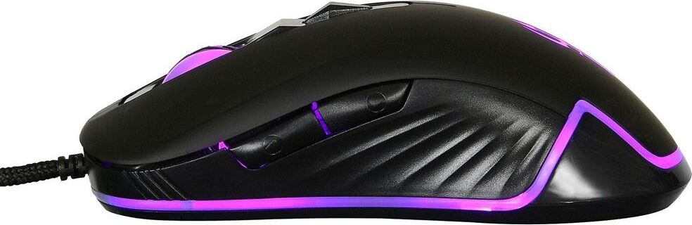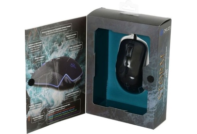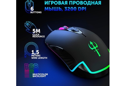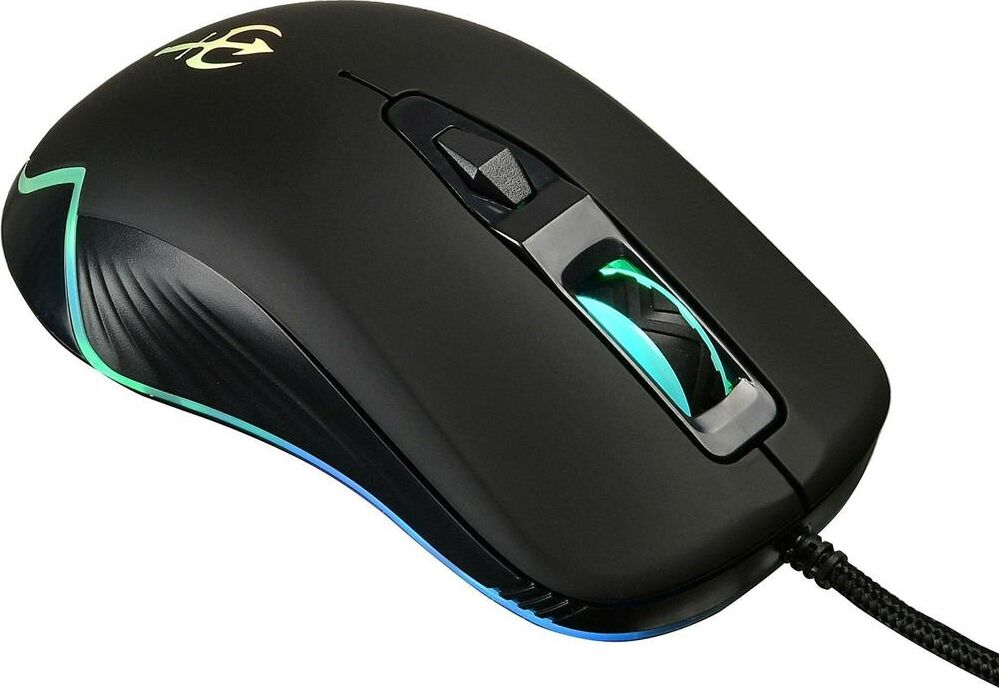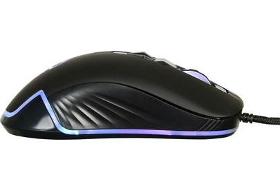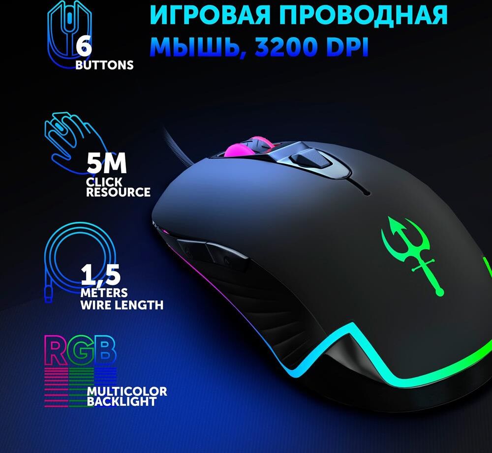 Мышь игровая, проводная, оптическая, интерфейс USB, количество кнопок - 6, колесо проктуртки, изменяемое разрешение - 800/1000/1600/2400 dpi, покрытие soft-touch, яркая подсветка корпуса, длина кабеля - 1,5м