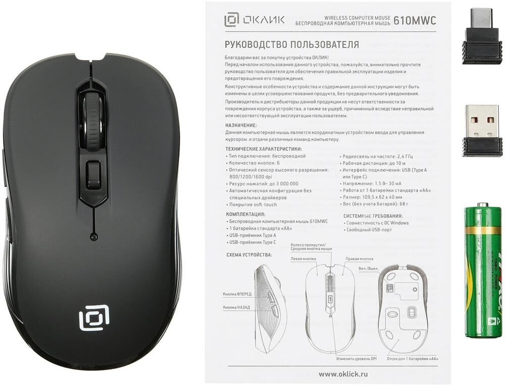 Мышь беспроводная OKLICK Мышь Оклик 610MWC черный оптическая 1600dpi беспров. USB/USB-C для ноутбука 6but (1158012)