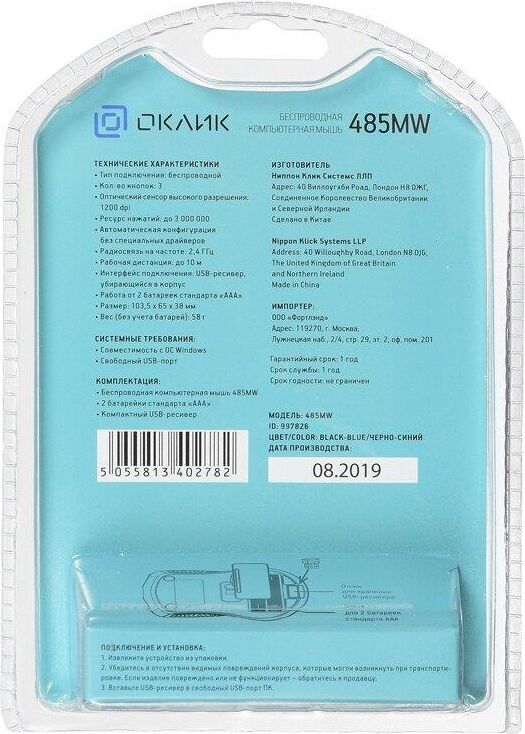 Мышь беспроводная, оптическая, количество кнопок - 2+колесо прокрутки, разрешение - 1200 dpi, радиус действия - 10 м.
