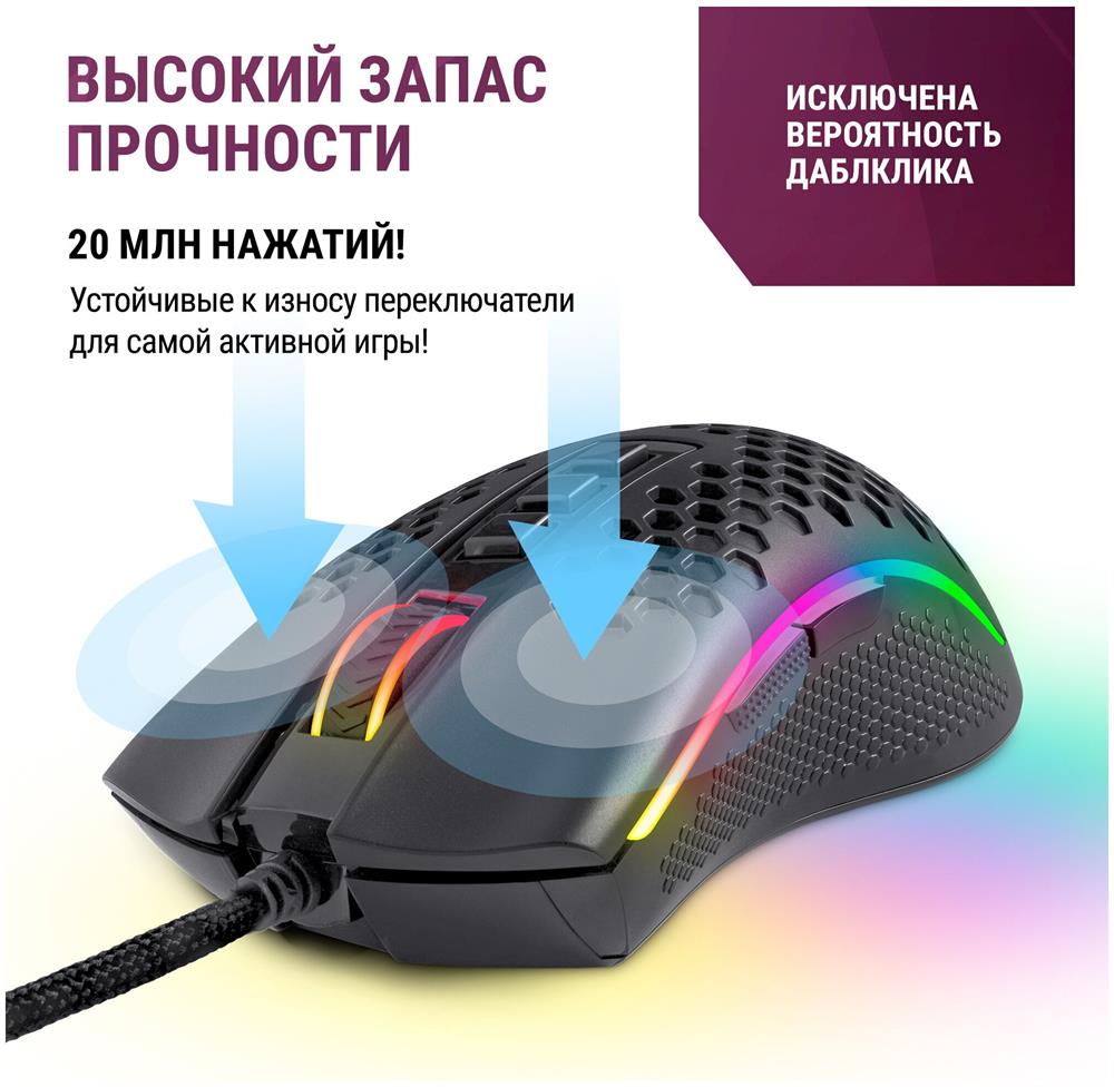 Гибкий тканевый кабель Прочные тефлоновые ножки легко скользят по поверхности стола Сохранение профилей Редактор макросов Кнопка переключения DPI Удлиненные тефлоновые ножки Уникальный запатентованный дизайн