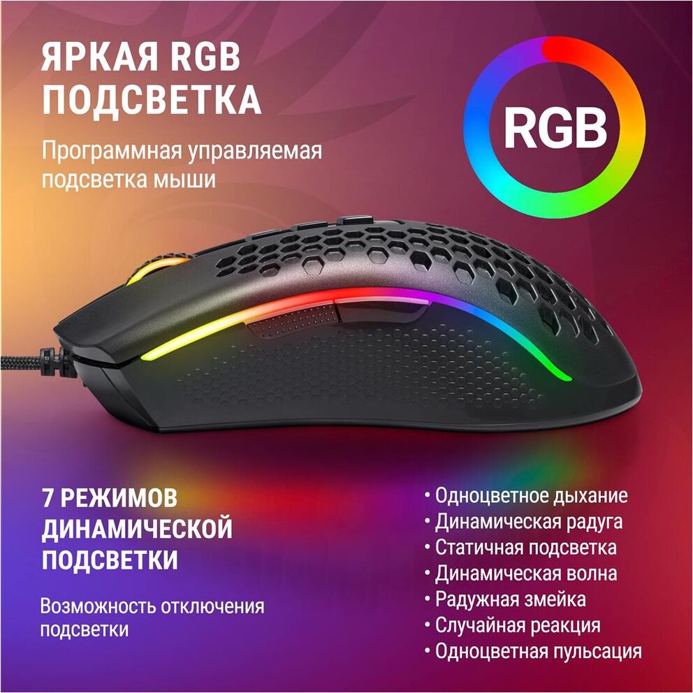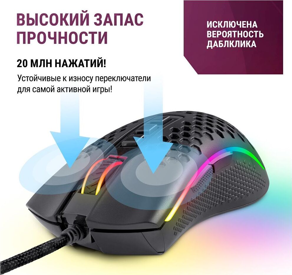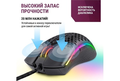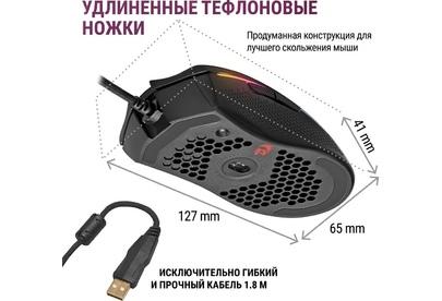 Гибкий тканевый кабель Прочные тефлоновые ножки легко скользят по поверхности стола Сохранение профилей Редактор макросов Кнопка переключения DPI Удлиненные тефлоновые ножки Уникальный запатентованный дизайн