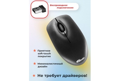 Мышь беспроводная, оптическая, 2 кнопоки , колесо-кнопка, оптическое разрешение 1000 dpi, интерфейс - беспроводной USB-адаптер, Soft Touch покрытие, цвет - черный.