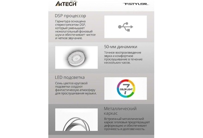 Конструкция Бренд A4TECH Модель Fstyler FH300U Тип гарнитуры стерео Крепление оголовье Тип конструкции мониторные Тип соединения гарнитуры проводные USB Крепление микрофона гибкий всенаправленный Регулятор громкости есть Тип регулятора громкости на наушниках Наушники Тип, акустический закрытые Диаметр головок излучателей 50 мм Частотный диапазон 20 Гц - 20 кГц Материал магнита Nd Импеданс 16 Ом Чувствительность динамика 100 дБ Микрофон Частотный диапазон 100 Гц - 10 кГц Чувствительность микрофона --44 дБ Шумоподавление микрофона есть Подключение Коннектор (гарнитура) USB Тип коннектора прямой Подключение кабеля одностороннее Длина шнура 2 м Особенности Подсветка есть Цвет подсветки разноцветный Цвет, вес Цвет белый Вес (без шнура) 238 г