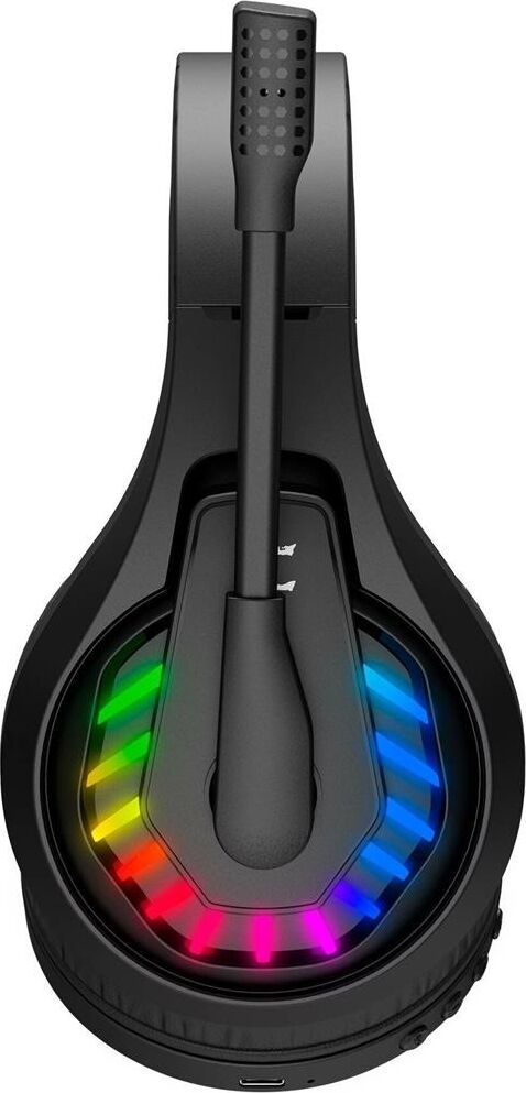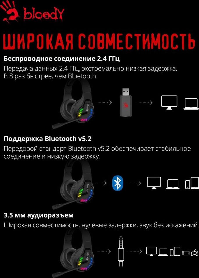Тип гарнитуры: стерео. Тип, акустический: закрытые. Тип конструкции: мониторные. Тип соединения гарнитуры: беспроводные bluetooth. Импеданс: 16. Чувствительность динамика: 105. Крепление микрофона: поворотный всенаправленный. Особенности: Возможность подключения несколькими способами - Bluetooth v5.2, 2.4GHz radio или через кабель.. Крепление: оголовье. Регулятор громкости: есть. Тип регулятора громкости: на наушниках. Диаметр головок излучателей: 50. Материал магнита: Nd. Режим объемного звучания: Стерео 2.0. Выключение микрофона: есть. Шумоподавление микрофона: есть. Подключение кабеля: двухстороннее. Для геймеров: да. Подсветка: есть. Время полной зарядки: 2. Время работы беспроводной гарнитуры: 40. Диапазон работы: 12. Разъем для зарядки: USB Type-C. Цвет подсветки: Neon. Коннектор (гарнитура): 1x3.5 мм. Габариты упаковки (ед) ДхШхВ: 0.217x0.105x0.225. Вес упаковки (ед): 0.7. Страна производства: Китай. Гарантия: 12 мес.. Частотный диапазон: 20 Гц - 20 кГц. Частотный диапазон: 100 Гц - 10 кГц. Цвет: черны